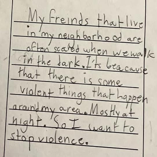 Students worked with workshop leader Lisa Browne to write junior activist plans, learning how to raise their voices and create change. One student explained why fighting violence was the priority.